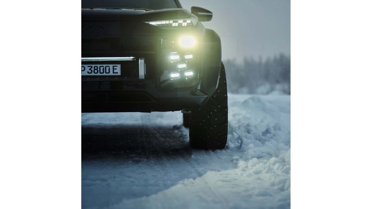 Elektrické SUV sa radikálne zmenilo vďaka inštalácii štyroch pásov namiesto štandardných kolies. To samozrejme výrazne zvýšilo svetlú výšku a výkonná ochrana napájania batérie je navrhnutá tak, aby poskytla dodatočnú istotu na ťažkom povrchu horských priesmykov. Na zakrytie stôp boli podbehy kolies rozšírené prekrytiami z uhlíkových vlákien. Nie bez prídavného osvetľovacieho zariadenia, ktoré bolo inštalované v prednom nárazníku a na expedičnom kufri.