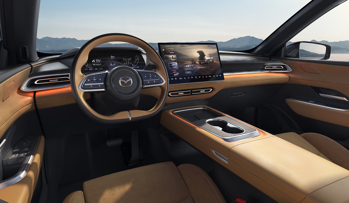 Interiér je tiež prenesený do štýlu Mazda s trochou krvi: palubná doska, dvojramenný volant a stredový tunel modelu EZ-6 sú pôvodné, ale vo všeobecnosti je zariadenie rovnaké ako v čínskom zdroji. Displej prístrojov má uhlopriečku 10,2 palca, multimediálny systém má 14,6-palcový dotykový displej, nezostali takmer žiadne jednotlivé tlačidlá a ovládače a volič prevodovky je umiestnený na stĺpiku riadenia. Nechýba veľká panoramatická strecha a kompletná sada elektronických asistentov a samoparkovací systém sa dá ovládať hlasom zvonku auta.