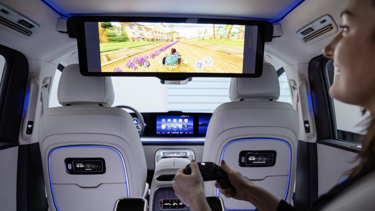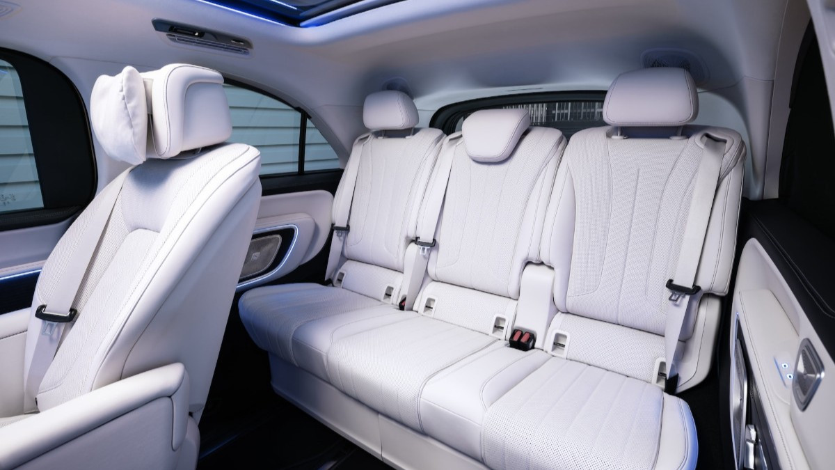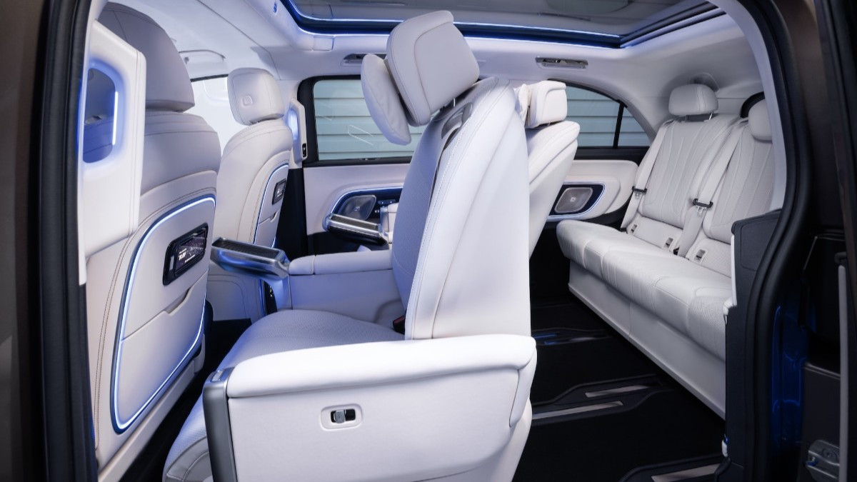 Interiér ponúka voliteľný systém MBUX Superscreen, ktorý zahŕňa 10,25-palcový digitálny prístrojový panel a dva 14-palcové displeje – centrálny pre informačno-zábavný systém a pravý pre spolujazdca. Voliteľne je k dispozícii aj 31,3-palcový monitor pre cestujúcich na zadných sedadlách. Je vysúvateľný zo stropu a ponúka rozlíšenie 8K, funkciu rozdelenej obrazovky a 8MP kameru pre videohovory. Súčasťou je aj audiosystém Burmester s 3D priestorovým zvukom a 22 reproduktormi a panoramatická strecha Sky View má ambientné osvetlenie. Interiér ponúka aj skladacie stolíky, viacero konzol s bezdrôtovým nabíjaním telefónov a vyhrievané a chladené odkladacie priestory.